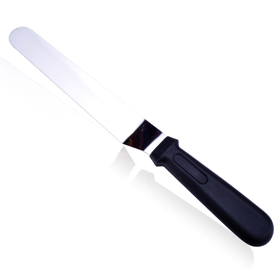 Contoured handle for easy and comfortable grip.  Great tool for spreading buttercream, ganache and other fillings.