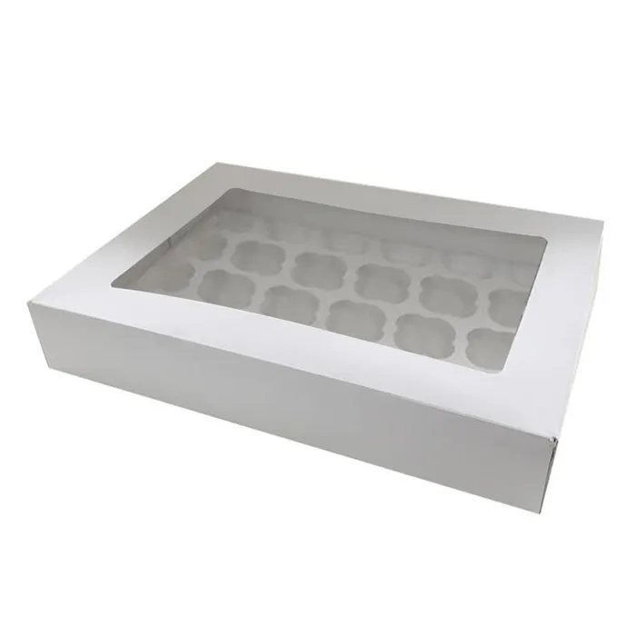 Holds 24 small sized cupcakes with 3.8cm base. Any of our baking cups labelled as 'small' will fit these boxes.