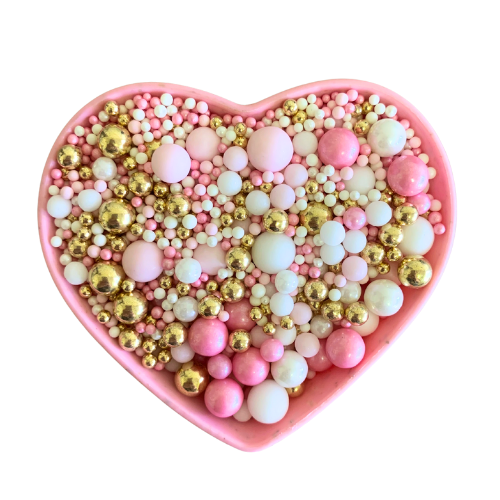 This mix of sprinkles features different sized pearls in matte and pearl pink, white and gold.