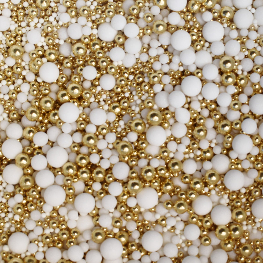This mix of sprinkles features different sized pearls in matte white and metallic gold.