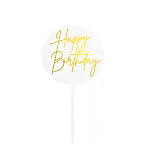 Clear acrylic topper with gold writing to add a birthday message to your cake.