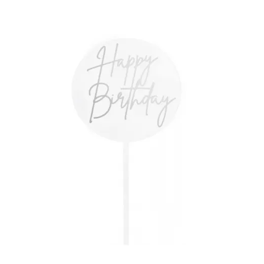 Clear acrylic topper with silver writing to add a birthday message to your cake.