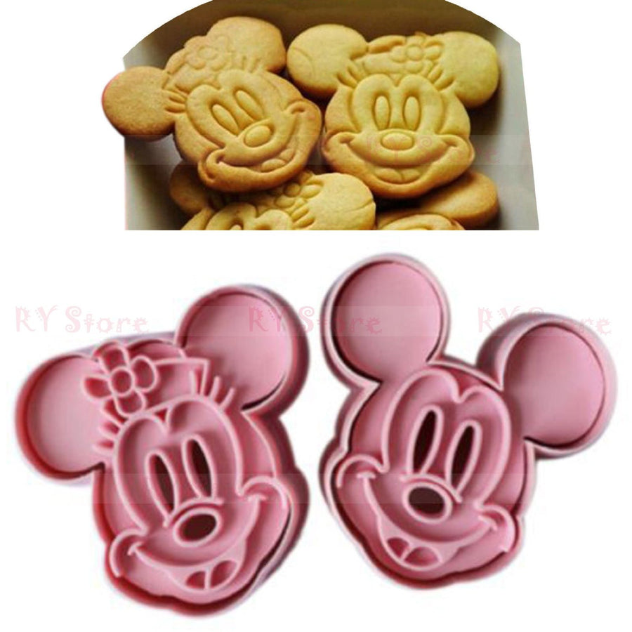Set of 2 Mickey and Minnie Mouse plunger cutters.  Embosses detail onto fondant, gumpaste, cookies, etc as they cut out.