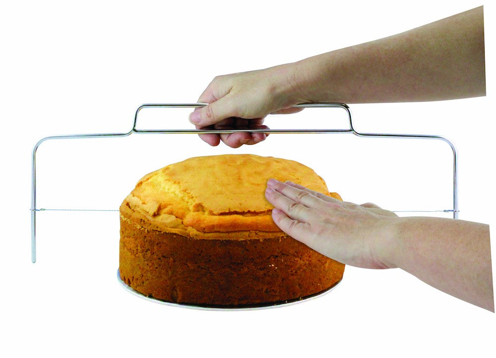 Easy to use, just adjust the steel cutting wire up or down on both sides until it reaches the height you need. It will cut layers up to 10cm / 4 inches thick. Once your wire is in place, pull it through your cake gently using a sawing motion.