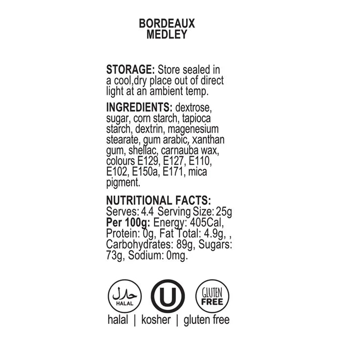 Dextrose, Sugar, Tapioca Starch, Corn Starch, Dextrin, Magnesium Stearate, Gum Arabic, Xanthan Gum, Shellac, Carnauba Wax, Colours E129 E127, E110, E102, E150A, E171, Mica Pigment