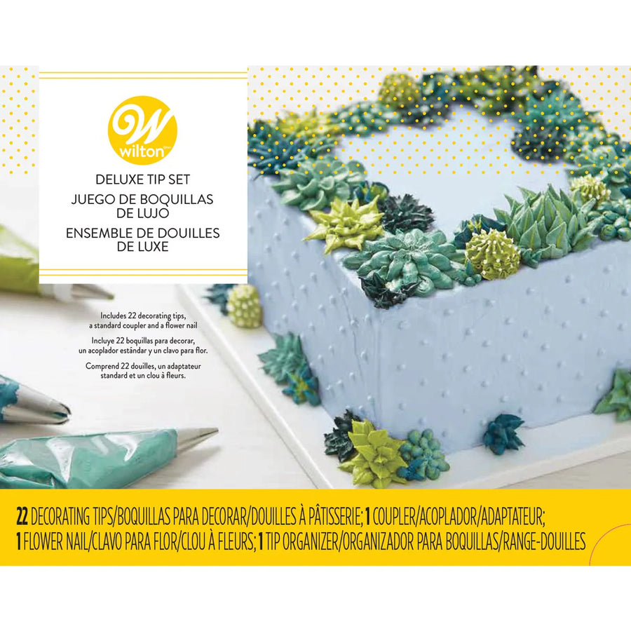 The deluxe set includes 22 decorating tips for a variety of decorating options. In addition, it contains a standard coupler and metal 1.25 in. flower nail. Plus, the entire set is contained in the Wilton Tip Organizer for perfect tip organization and storage.
