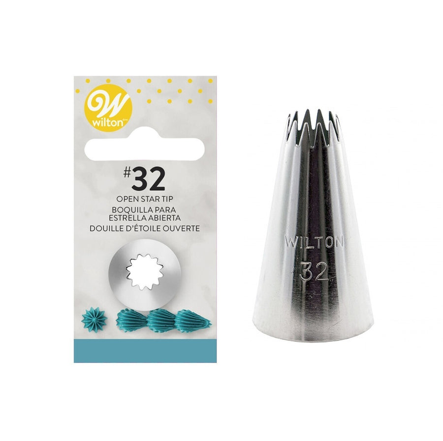 The Wilton 32 tip is a versatile open star piping nozzle that’s great for creating swirls, stars, rosettes, and borders on cakes, cupcakes, and cookies. It produces a clean, classic star shape and works well with buttercream, ganache, or whipped cream or any other airy icing!