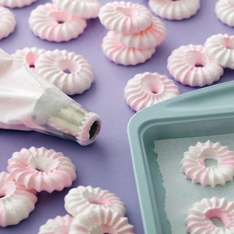 Try this tip on cookies, cupcakes and macarons, then fill the center with ganache or jam. You can also use this tip to pipe elegant meringues, then leave the center empty for a unique design. You can even use this tip to top your cupcakes with a whipped cream topping, then fill the center with a candied cherry or some chocolate hazelnut spread.