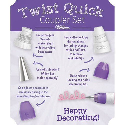 Change decorating tips with a quick twist! Our four-piece coupler system saves time by making tip changes easier and faster when decorating. Includes coupler cap, coupler tip lock, coupler body and coupler base.