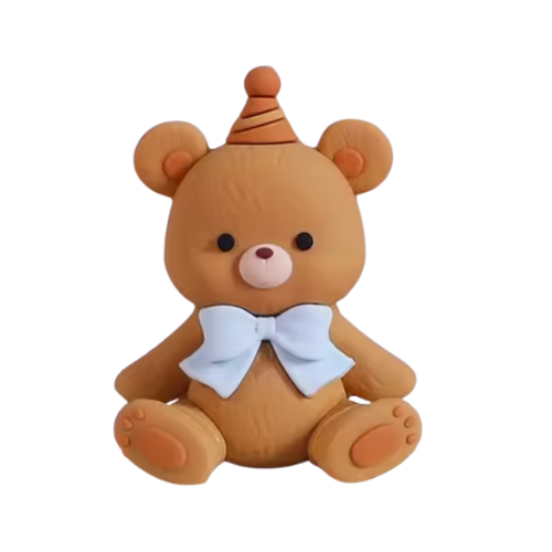 This sweet plastic teddy bear cake topper is dressed for a party with a blue bow and brown party hat. Perfect for first birthdays, baby showers, or bear-themed celebrations, it adds a cute touch to your cake.