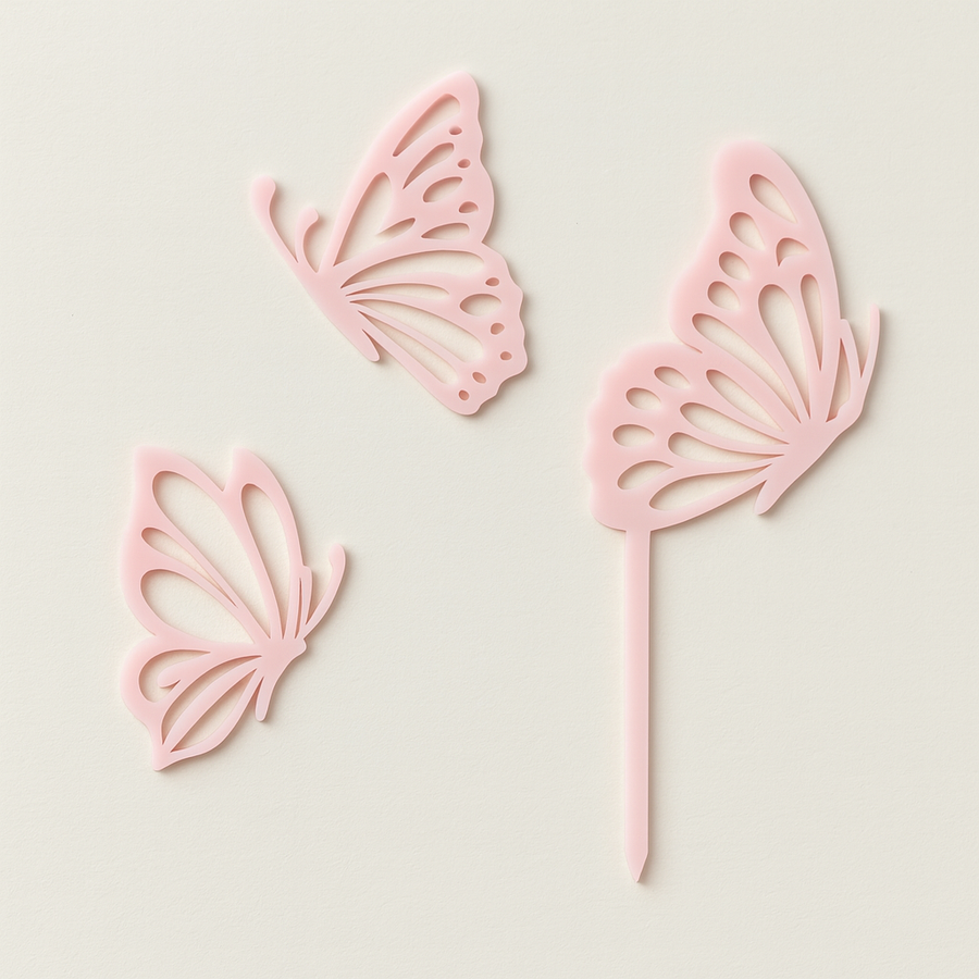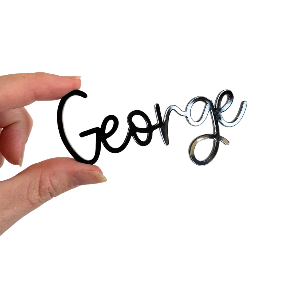 Our acrylic cake charms are designed to sit flat on the top or side of your cake (no pick attached). You can customise the size, colour, and font to suit your style.